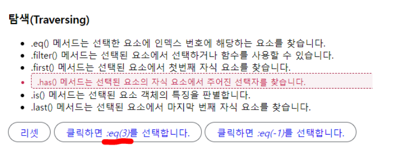 [개발] 프로그램 지식 [jQuery] eq() - 반응형 jQuery의 ed()는 선택한 요소의 "인덱스 번호"에 해당하는 "요소"를 찾습니다. ( 인덱스 번호는 "0"부터 시작합니다. ) 문법 : $("선택자").eq("숫자"); 추가설명 : - 선택한 요소의 형제 중 숫자를 통해 요소를 선택합니다. - "음수"를 설정하면 끝을 기준으로 선택합니다. 0부터 시작하므로 4번째 줄에 있는 값이 선택됩니다. 반응형 공유하기 게시글 관리 더 코딩 _ The Coding 저작자표시 (새창열림) '[개발] 프로그램 지식' 카테고리의 다른 글 [eclipse] ● 이클립스 SVN 기초 사용법 ● (0) 2022.02.08 [teamViewer] 2022 기준 원격 팀뷰어 _ 고정 비밀번호 변경 방법 (0) 2022.02.07 [javascript] 문자열이 빈 문자열인지 체크, 기본 문자열 리턴 str check (0) 2022.02.06 [javascript] 문자열이 빈 문자열인지 체크, 기본 문자열 리턴 str check (0) 2022.02.06 [kendo ui] message안에서 사용하는 속성들 (0) 2022.01.31 Contents 당신이 좋아할만한 콘텐츠 [eclipse] ● 이클립스 SVN 기초 사용법 ● 2022.02.08 [teamViewer] 2022 기준 원격 팀뷰어 _ 고정 비밀번호 변경 방법 2022.02.07 [javascript] 문자열이 빈 문자열인지 체크, 기본 문자열 리턴 str check 2022.02.06 [javascript] 문자열이 빈 문자열인지 체크, 기본 문자열 리턴 str check 2022.02.06 댓글 0 + 이전 댓글 더보기